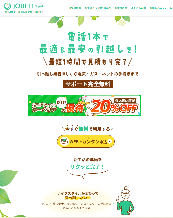 これらの手続きを一つずつ自分で行うと、数時間、時には数日を費やしてしまいます。 そんな「引っ越しに伴う煩わしさ」をすべて無料で解決してくれるのが、 今注目を集めている「ジョブフィットスーペリア」です。