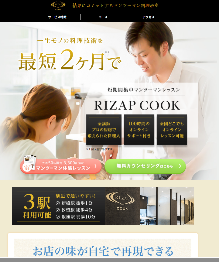 RIZAP COOK(ライザップクック)は、そんな料理に自信が持てない主婦の方こそ、劇的な変化を実感できる「大人のための料理の学校」です。